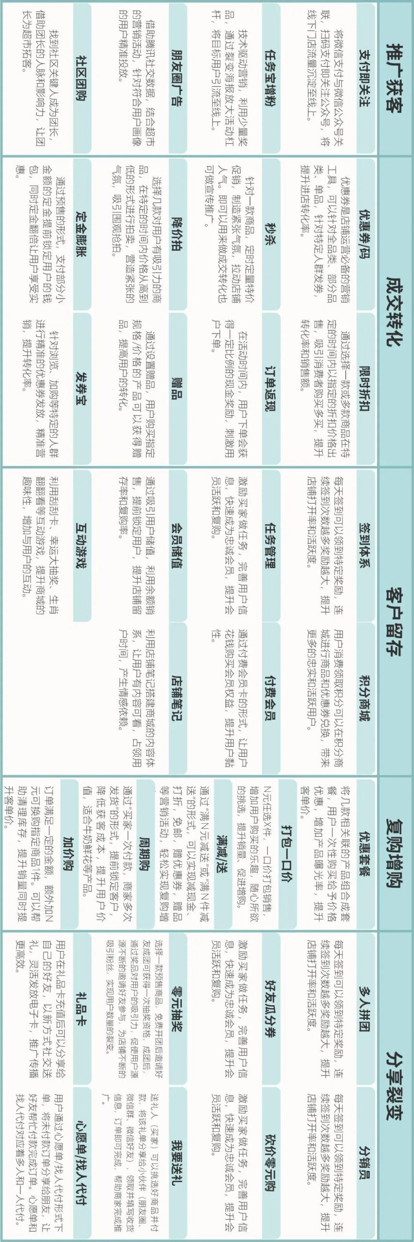 这里我将采用拉新、激活、留存、转化和推荐的互联网应用平台的标准进行拆解,同时也将电商平台常用的营销玩法根据AARRR的分类整理成了一张图表,供大家参考。