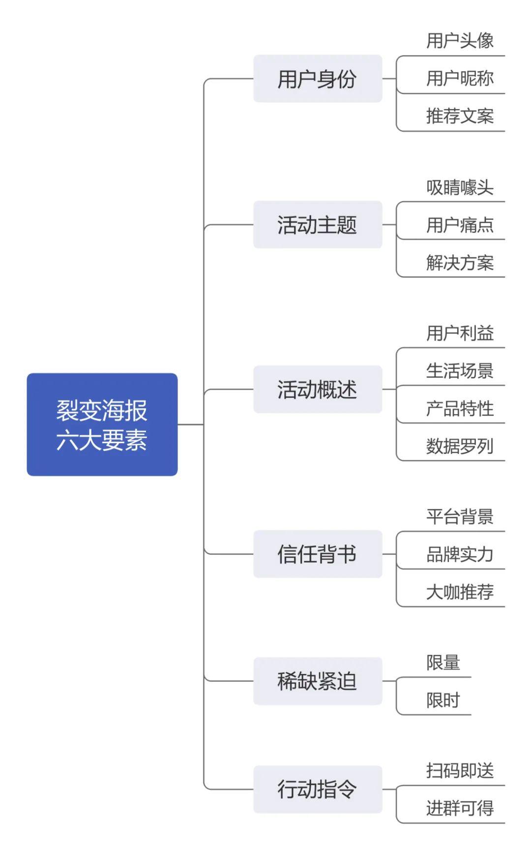②设计:设计需要完成活动中需要的主题海报、推文封面图、分类导航、Bananer图、页面原型以及线下物料等的设计工作。设计同样是专业技能,这里也不做展开了。目前最火爆的活动玩法就是分享裂变活动,裂变海报是裂变活动中不可或缺的元素之一。我梳理了裂变海报的六大要素,做成了一张思维导图分享给大家,在设计裂变海报时可以借鉴。