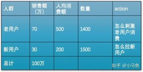 也可以按新用户、老用户来推算。如下图所示。老用户对你的信任度高,通常人均消费额会高些,新用户消费会低些。这么一拆,100万的销售额就会变成怎么刺激1400位老用户消费,以及怎么拉到1500个新用户来消费。
