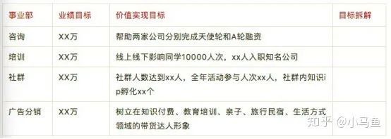 - 价值实现这栏里我会写累计影响多少人次,私域流量池扩大到多少,孵化知识ip多少个,等目标。