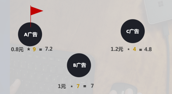 A\B\C广告他们的出价分别是0.8元/1元/1.2元,相应的广告质量得分是9/4/7,他们同时竞争的话,是A广告获得了这次的曝光机会,那为什么B广告和C广告出价比A广告高,还没有得到曝光呢?就是因为有广告质量得分这样一个因素在。