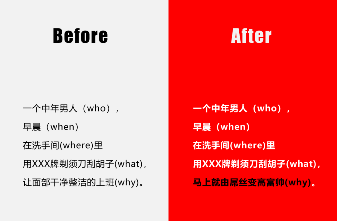 “一个中年男人(who),早晨(when)在洗手间(where)用XXX牌剃须刀刮胡子(what),让面部干净整洁的上班(why)。”