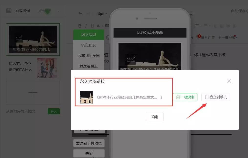 甚至,可以直接将“永久预览链接”推送到手机,但前提是必须关注该第三方插件公司的公众号。