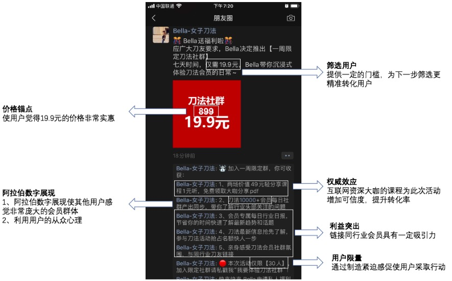 在女子刀法的个人号中应该存在着几类用户:会员、潜在客户、无兴趣用户。成为会员已经交了 899 元并享受着女子刀法的各项福利和人脉资源;潜在客户在等待观望,等待一个动机让他们愿意为会员费献出自己,可能是进一步优惠的价格,也可能是更具吸引力的产品价值;无兴趣用户只是将运营界大佬们的话题作为茶余饭后的谈资,无论是价格或是价值已经无法再打动他们了,当一条咸鱼挺好。