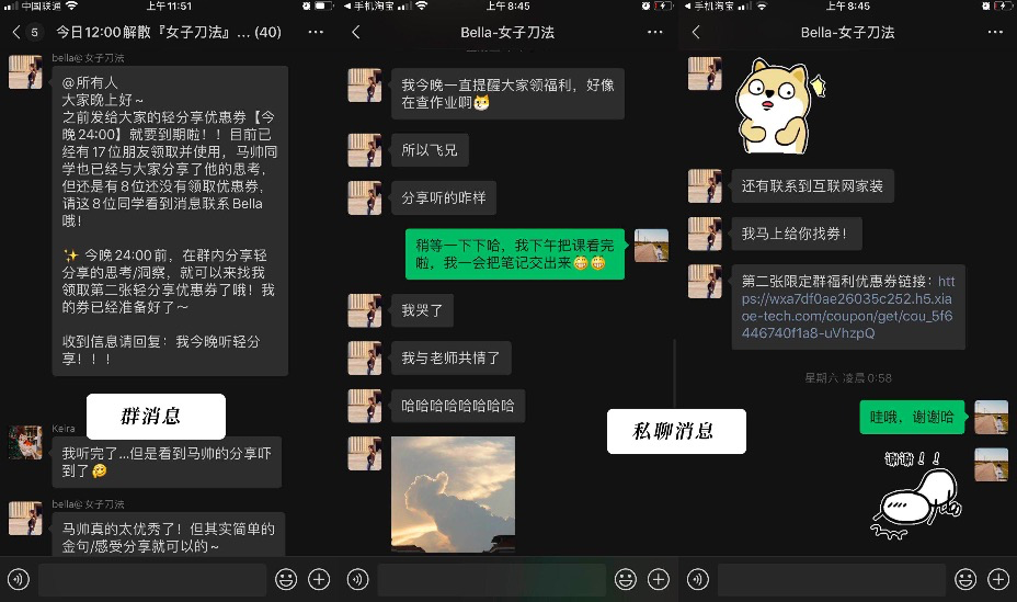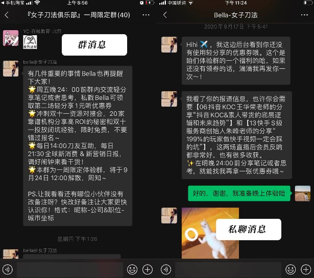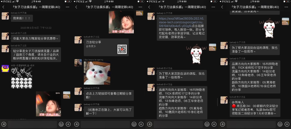 倒数福利发放机会,让用户增加紧迫感,为了能获取福利而邀请更多好友加入;提升获取福利的荣誉感与珍贵程度;让群内用户对大咖讲师的「轻分享」有个基础的印象;成为女子刀法会员就可以 1 元听所有大咖讲师的「轻分享」为后面的成功转化用户埋下伏笔。