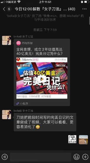 女子刀法和其他平台不同的是将每日的日报放在晚上睡前时间段,让用户在睡前可以再回顾一遍今天发生的品牌热点,由于公众推送方式的变革,将公众号文章同步分享到社群中有利于文章阅读量的增加(用户在第一时间内可以接受到女子刀法的干货)。
