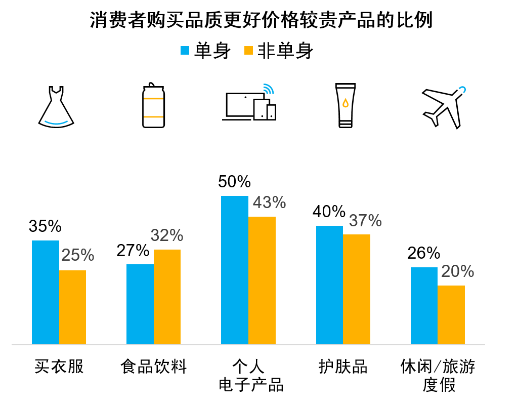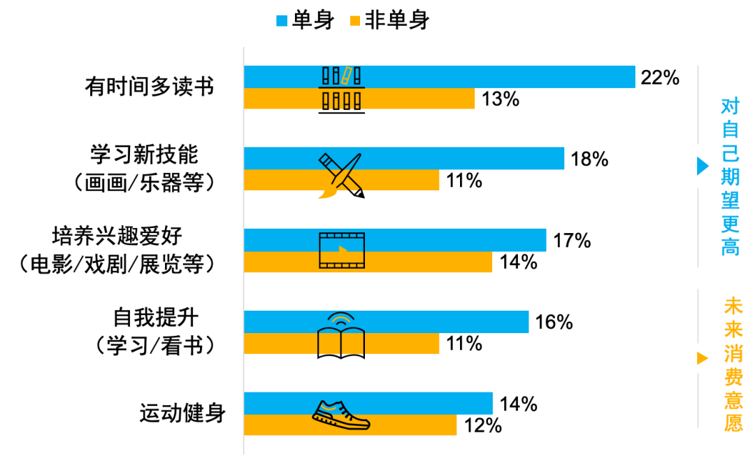 根据尼尔森发布的《中国单身经济报告》指出,单身群体中只有1%左右的人面临着养老及子女教育问题,因此也展现出更加强的消费能力及消费意愿。无论是购买衣服、电子产品、自我投资,消费强度及金额均超越非单身群体。也就是说,单身经济还处于一片蓝海之中。