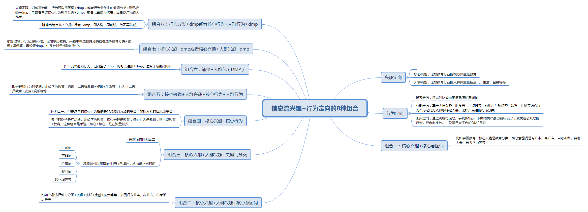 同上,你账户已经投放了一段时间,设定了符合账户的dmp之后,你可以尝试一下兴趣不限,只设行为分类+dmp。比如百度信息流就是搜索词+dmp,广点通就是行为分类+dmp。这样组合八就可以与组合七对比。或者可以延伸出组合九:兴趣+行为分类+dmp。