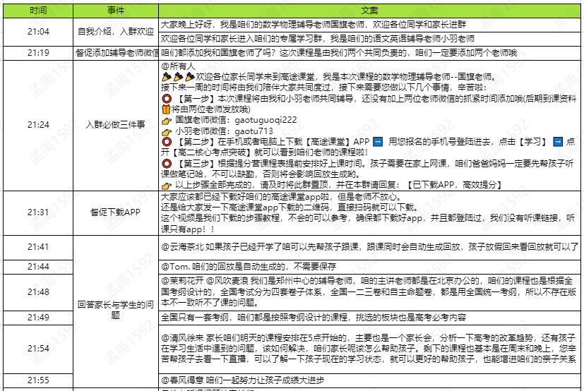 自我介绍-->入群欢迎-->督促添加辅导老师微信-->入群必做三件事-->回答家长与学生的问题(此处有托)-->写给家长的话-->事项提醒-->道晚安。