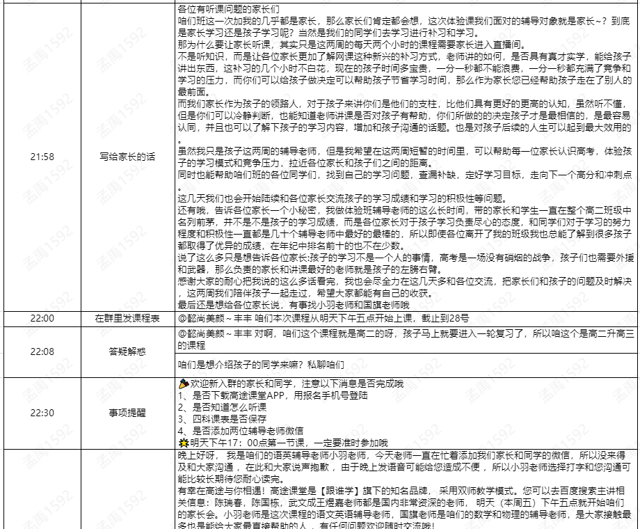 首课是家长会,从逻辑上家长会一般安排在快结束,但今年比较奇怪的一点是,猿辅导的家长会也是首课,学而思网校的家长会在中途。分析原因可能有两点,(1)首课开家长会,后面就很方便卖课,不存在家长不清楚高途课程的情况;(2)首课往往是到课率最高的一节,这样有更多的人听课。