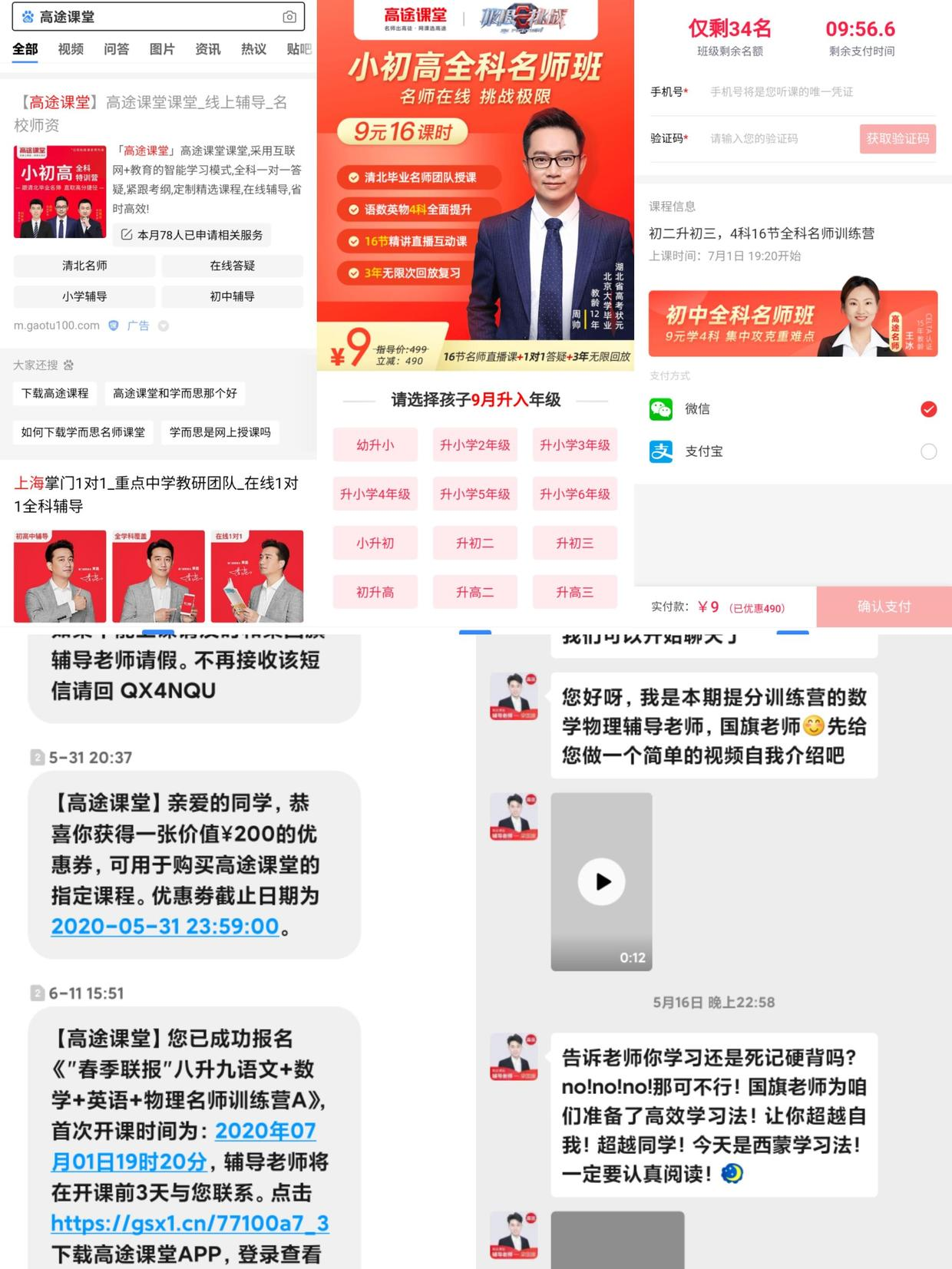 添加好友之后是小视频形式的自我介绍,后续重点是三个动作:发资料和学习建议、提醒上课、课程广告。朋友圈是学习建议+学员反馈+上课提醒+课程广告,以及适当的个人生活。假如学员未添加老师微信好友,辅导老师会疯狂地发短信,以及打电话要求其加微信好友;同时,若被后台监测到没有上课,辅导老师也会疯狂地打电话,一次至少打3个。
