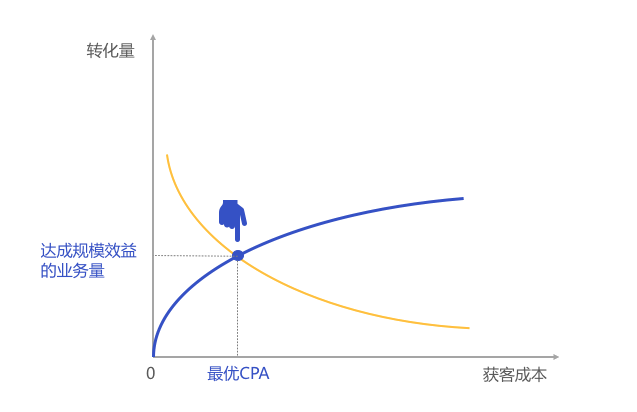 我们的投放目标是「能够控制住CPA的成本,且保持足够的量」。最优CPA肯定不等于更低的CPA,而是在成本与转化量之间找到一个平衡点CPA。如下图,我画了个均衡图来解释这里面的逻辑,希望帮助大家理解。