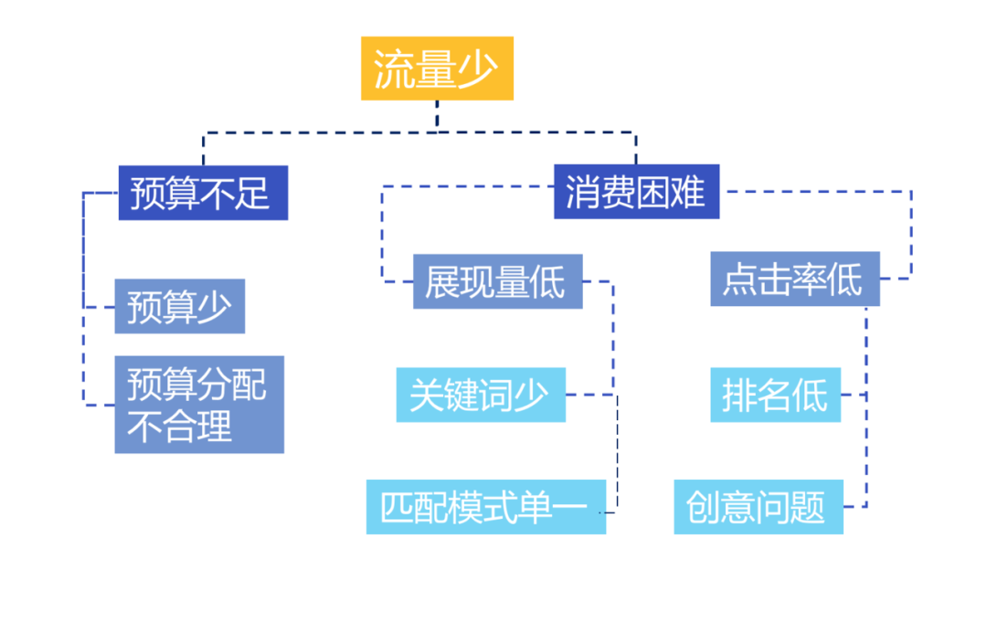 此外,还可以通过外部提升转化量的方法。我们可以根据下面的「流量问题归因图」标记出流量少的外部主要诱因,逐个击破。