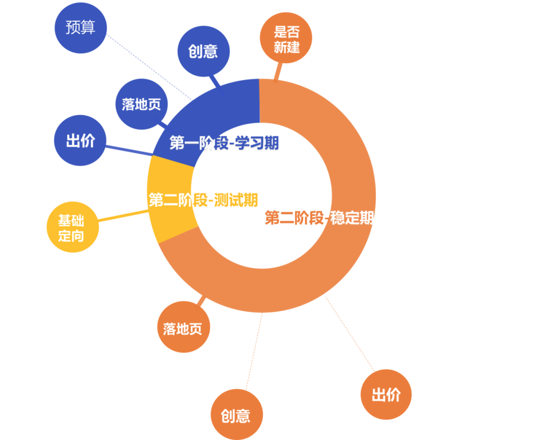 (1)账户第一阶段,需要依靠人,提供充足和良好的数据“饲料”。第一阶段的效率取决于优化师在CPC阶段的能力,从账户结构、策略调整、创意优化、效果分析等,需要用可控的成本凑足转化门槛,让机器知道什么流量是所需要的。