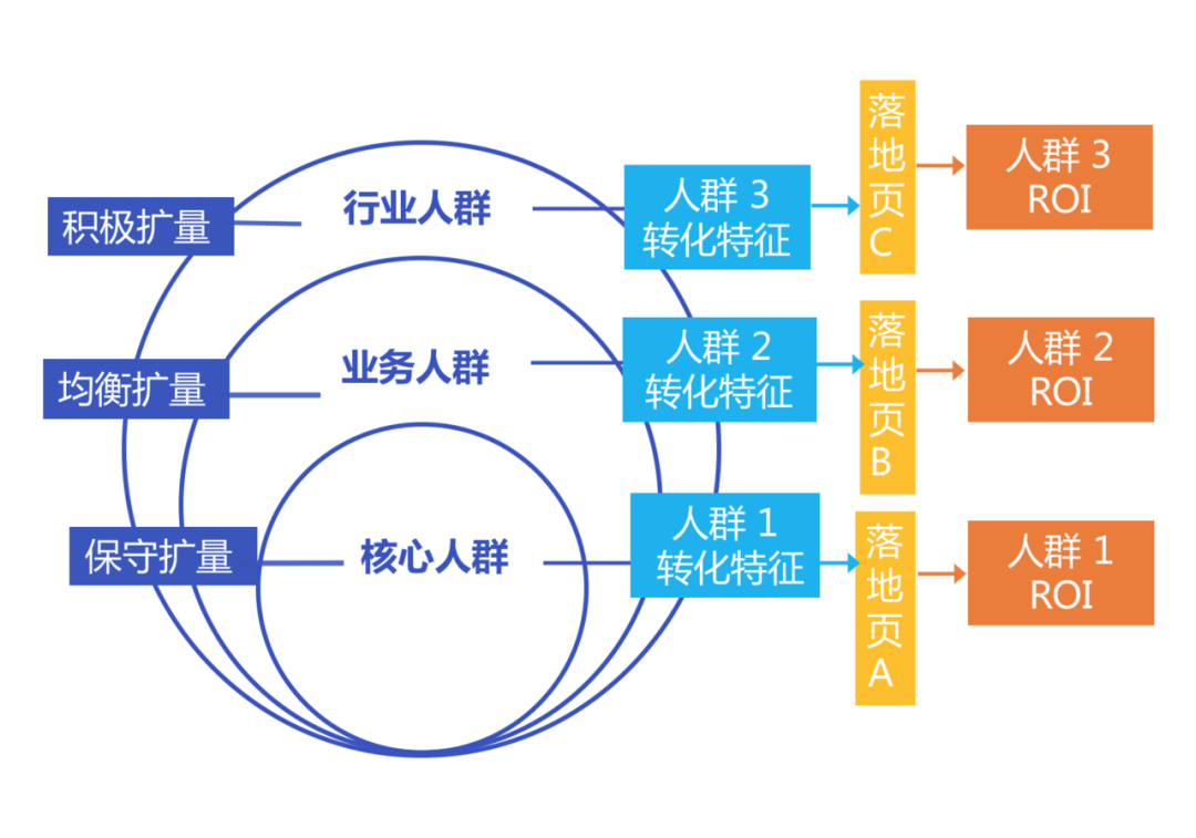 投放的时候,可以建立不同的计划,采用不同的拓量模式,对接不同的落地页。通过完善的转化优化/分析工具,帮助企业积累属于自己的分群识别能力,从而对不同价格/属性的流量探索出一套属于自己的ROI算法。