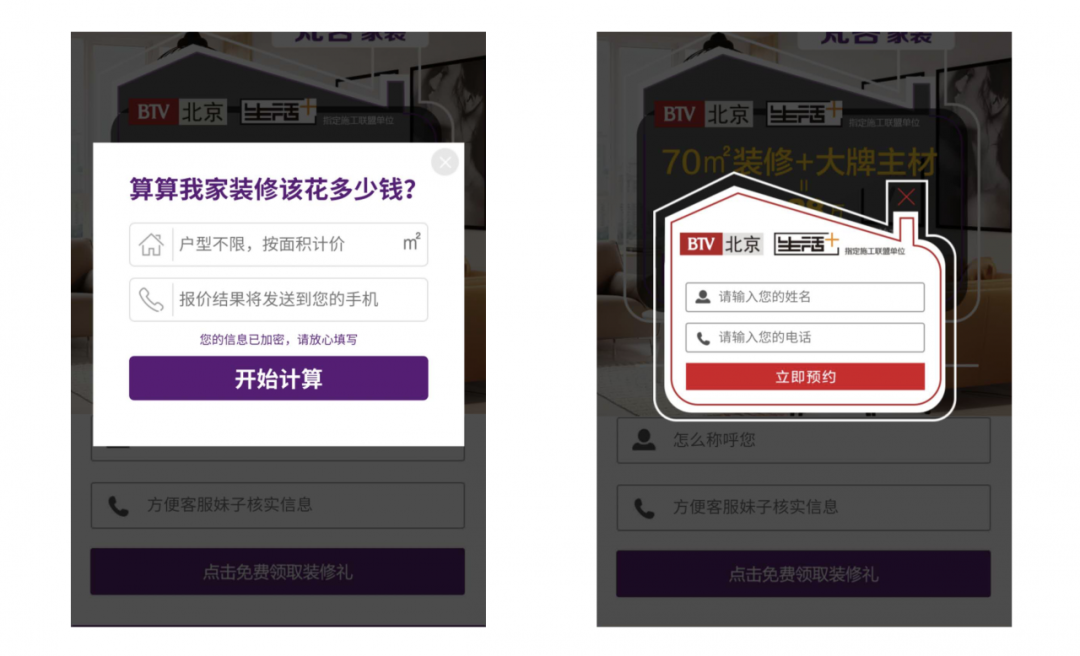 我们还可以针对不同的受众,弹出不同的挽留弹窗。如上图所示,某装修品牌因为和北京电视台合作了一档节目,所以针对北京用户显示右侧的节目报名弹窗,而针对其他城市显示左侧的报价弹窗。