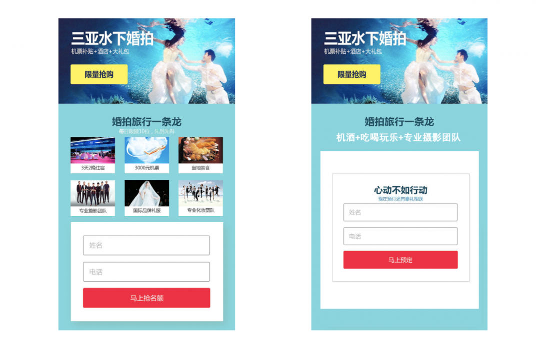 如上图,某旅行婚纱摄影品牌的落地页首屏,适当删减元素后,可以让主题更专注、清晰,引导动作也更聚焦。