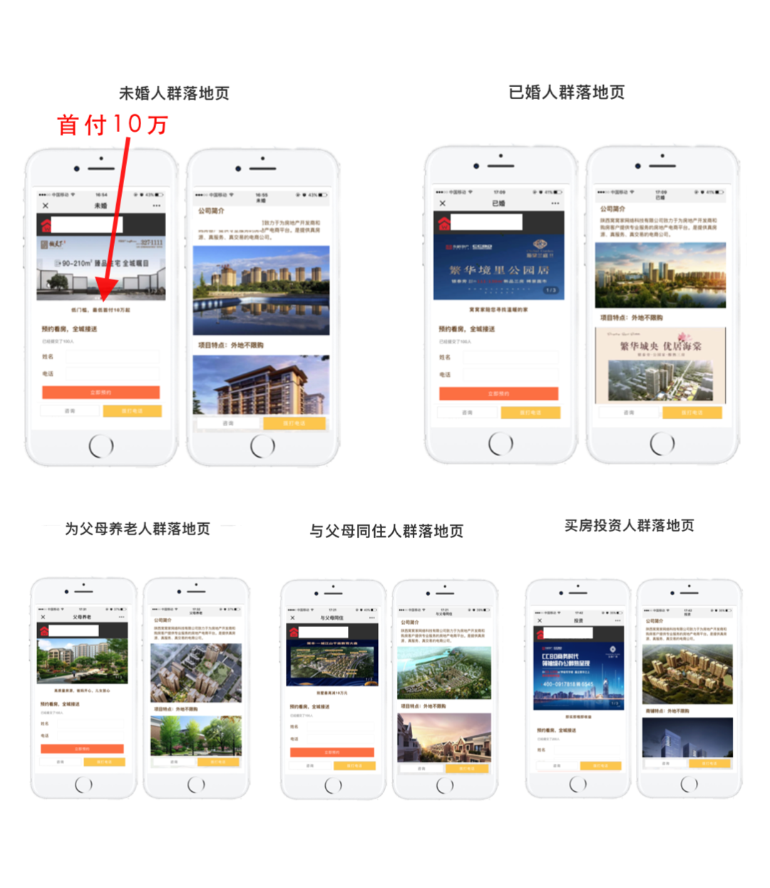 如上图,抓住这5类群体的最相关痛点,分别制作了5个不同的落地页。如:未婚类的落地页在首图突出低门槛、首付10万;已婚会突出社区优美、精装修,作为新居体面等。