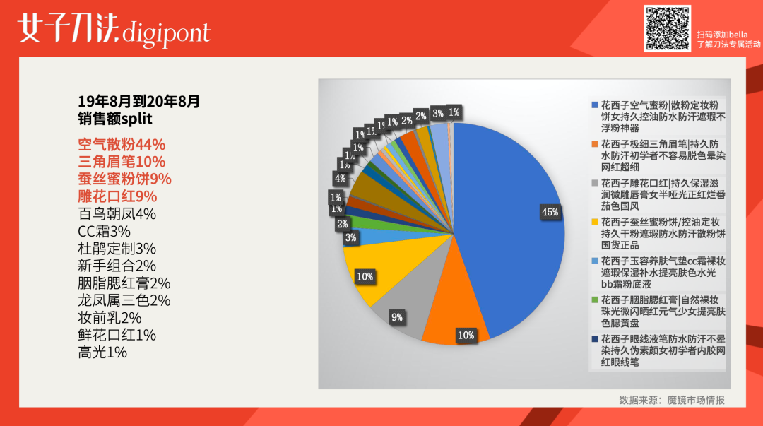可以看得出一开始花西子就打的是脸部底妆(散粉+CC)、腮红、眼部(眉笔)和口红。