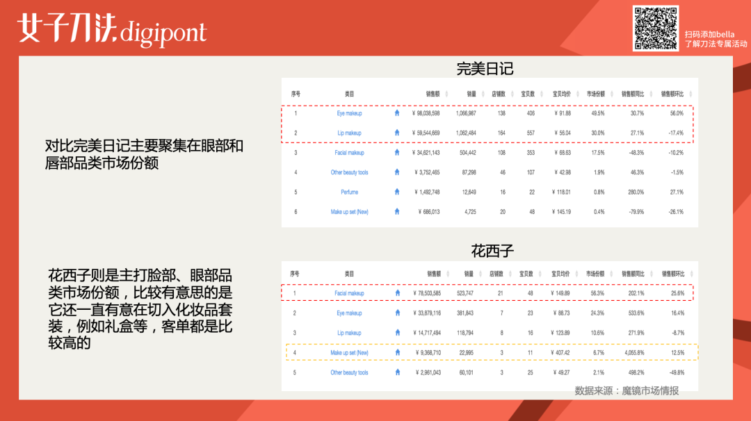 比起完美日记主要聚集在眼部(主要)和唇部、脸部品类市场。花西子则是主打脸部(主要)、眼部、唇部和套装品类市场。