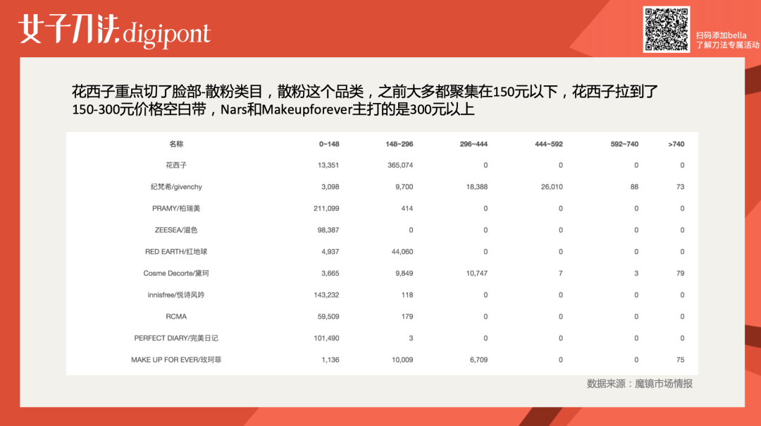 花西子重点切了脸部-散粉类目,之前大多都聚集在150元以下,Givenchy、Nars和Makeupforever主打的是300元以上,花西子拉到了150-300元价格空白带,并且活生生的把这个散粉品类从一个小众品类直接科普成了一个人人皆知的品类。