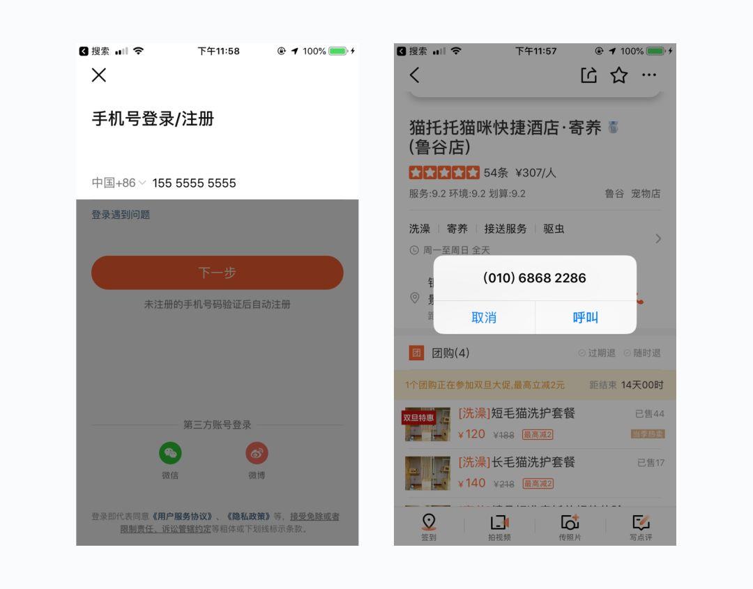 7±2法则最简单的应用就是信息分类,最最常见的例子就是手机号的模块组合,通常情况下被割裂成“3-4-4”的组合方式,减少用户的记忆方式。例如大众点评的注册页面和电话呼叫弹窗,都遵循了7±2法则。