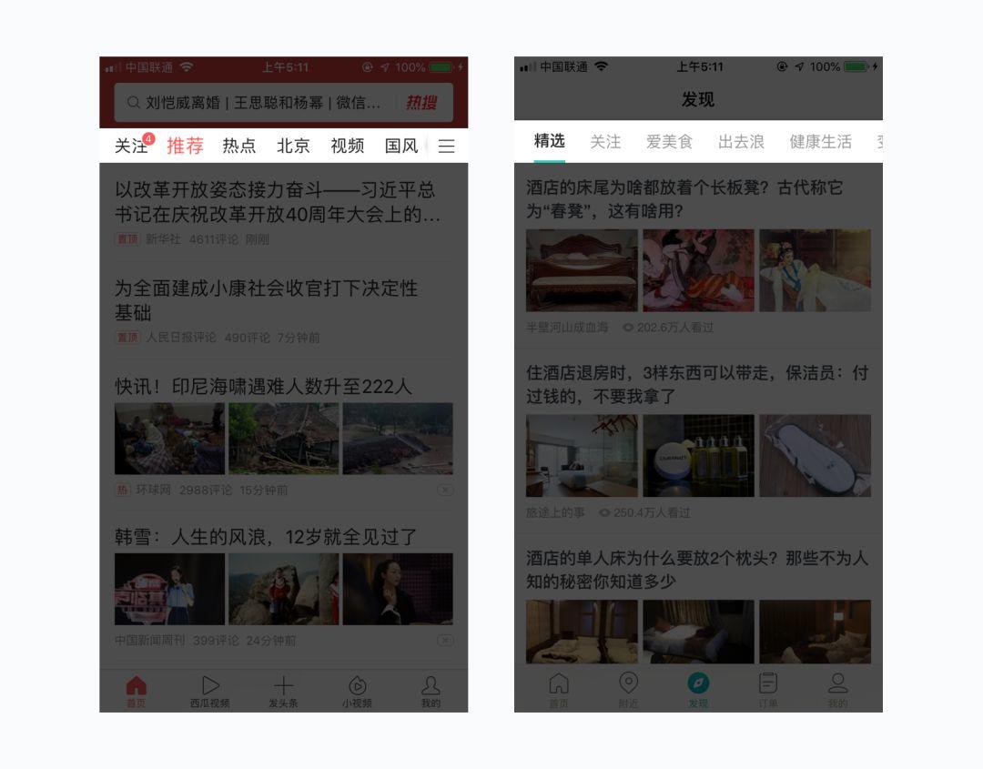 我们可以查看线上大部分的 app 顶部导航栏,都严格遵循了7±2法则,虽然在横轴可无限滑动,但在显示区域只保持7±2法则的显示数量,例如今日头条、美团等等。