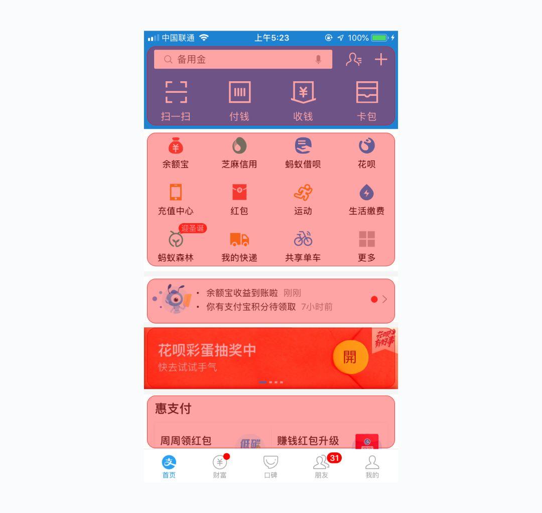 支付宝通过对同类型的功能内容进行组合,将大量的内容组合成模块,通过现寻找模块在寻找具体功能的方式,提高了用户的操作路径。