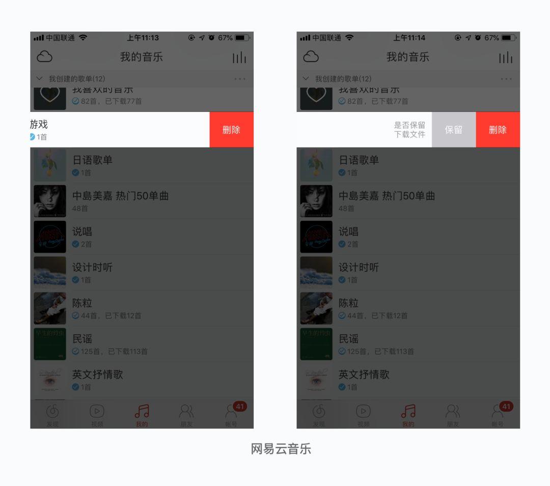 在网易云音乐中的歌单页面中,侧滑删除歌单的时候,只给用户“一到两个”选择,用户可以根据自身的需求进行快速的选择,不需要耗费大量时间进行认知思考。