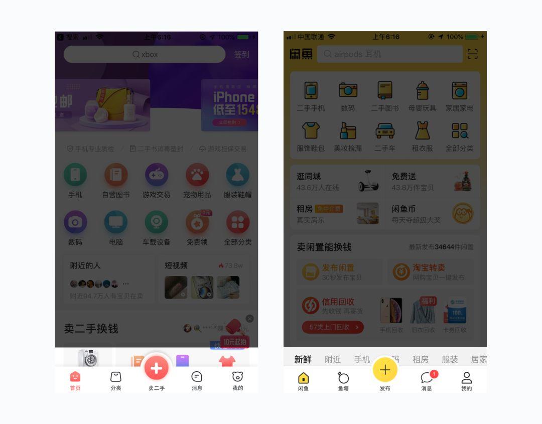我们可以明显的看到转转的“卖二手”和闲鱼的“发布”区别于其它的 icon 设计,使核心功能跳脱出来,让用户记忆深刻。