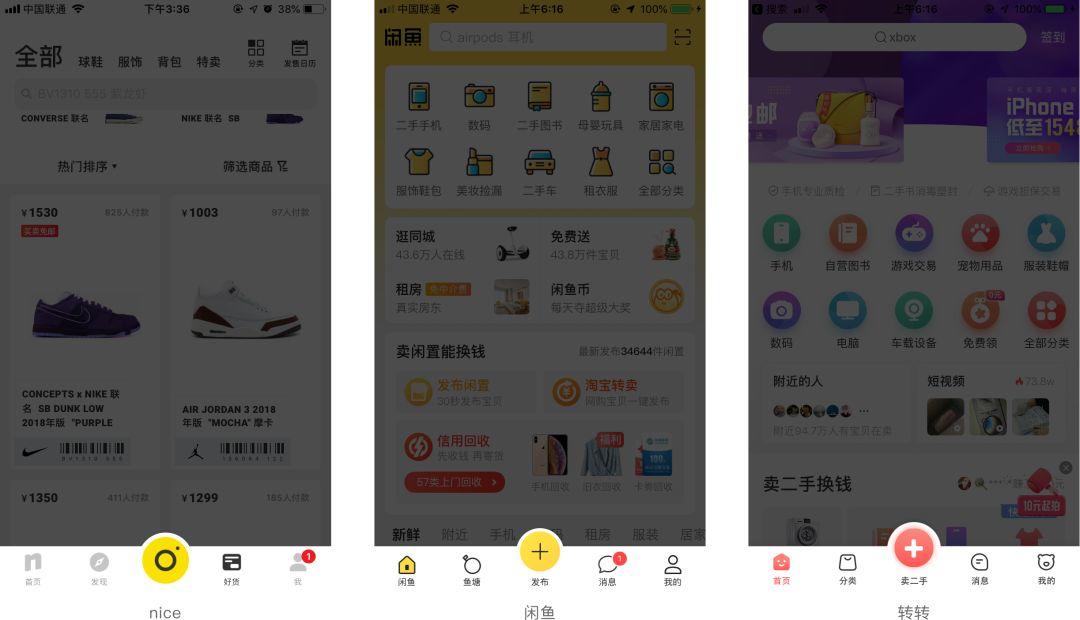 例如nice、闲鱼、转转的发布栏按钮,属于产品的重要核心功能,放大之后扩大了按钮的热区范围并增强了视觉冲击力,更加容易操作。