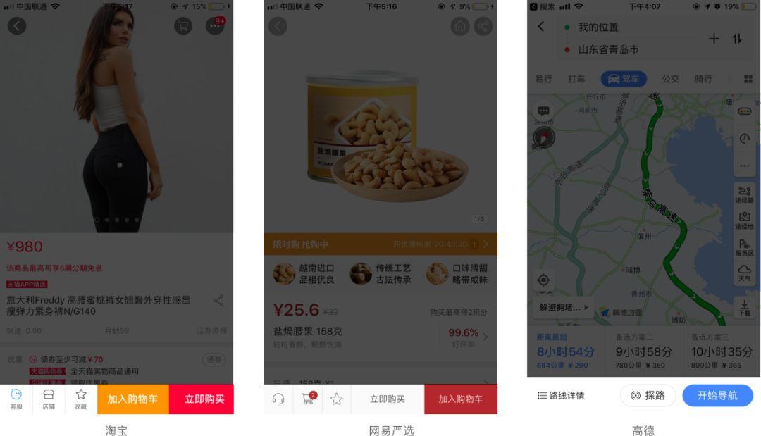 相关联的功能经常出现在底部操作栏中,我们以淘宝、网易严选、高德地图为例,它们的底部操作栏相关联的功能按钮都靠在一起。