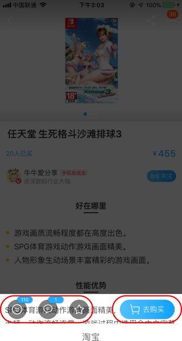根据功能层级的重要性,我们可以将次要的功能放小一点。例如淘宝中介绍详情页的底部,“去购买”的功能层级明显大于其他三项(点赞、评论、收藏)的重要性。