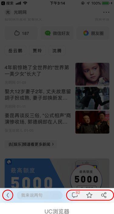 功能类型不同按钮放在一起很容易造成误操作,例如UC浏览器中详情页的底部,“返回”和“评论、收藏、分享”的功能类型不同,如果靠在一起则容易引发误触,所以相隔很远,尽量避免误操作。