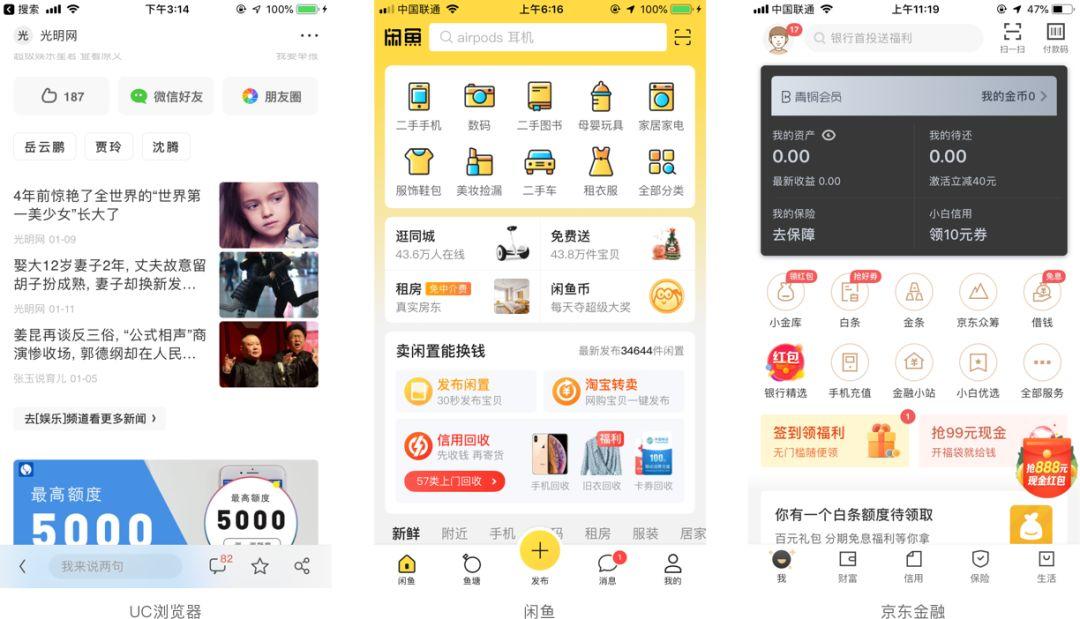 例如UC浏览器的详情页和闲鱼以及京东金融的首页,整体布局都趋于对称、规则和平滑。