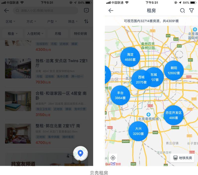 在设计中,我们首先要以业务和实现用户的需求为主。例如贝壳租房中区域查找房源页面右下角的低于icon,点击之后展开的地图之后,用户可以直观的在的地图上查找区域内的房源。