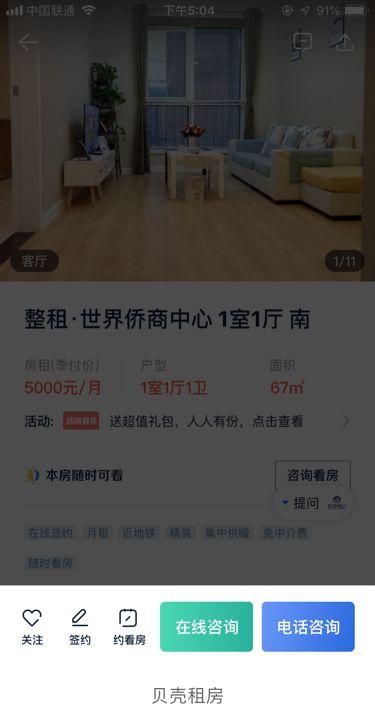 例如贝壳租房的详情页中的底部操作栏,“在线咨询”和“电话咨询”按钮通过添加背景色来引导用户点击。