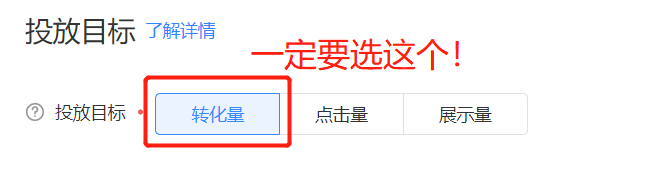 投放目标:这个非常重要,不用测,直接选“转化量”。选“点击量”或者“展示量”成本就会高的离谱;