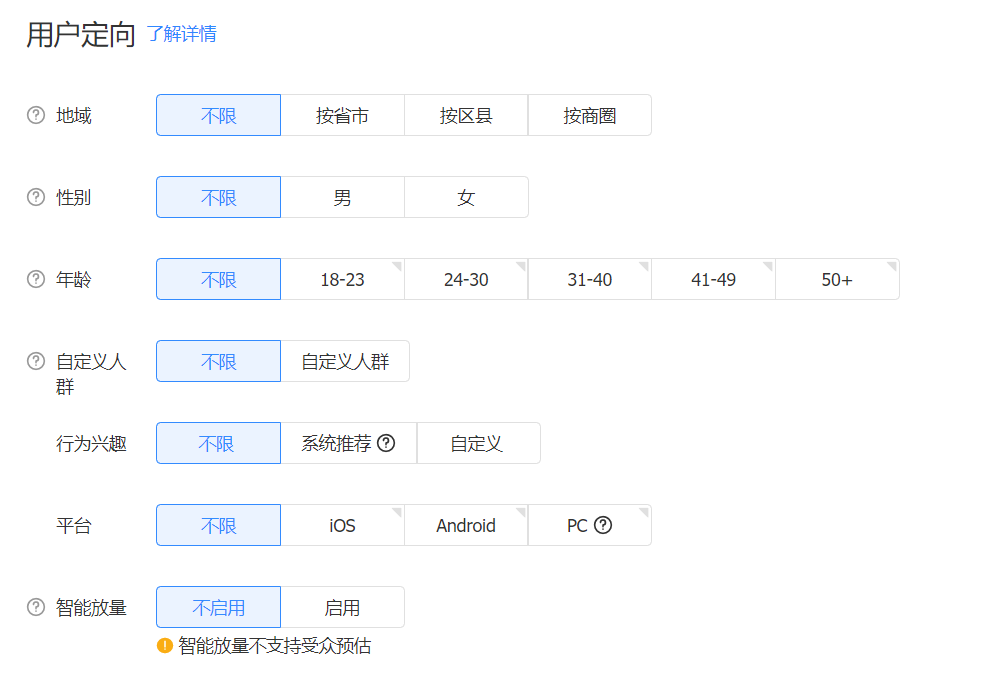 宽定向是指不设置定向,或者设置很少的地方,预估用户覆盖数过亿;