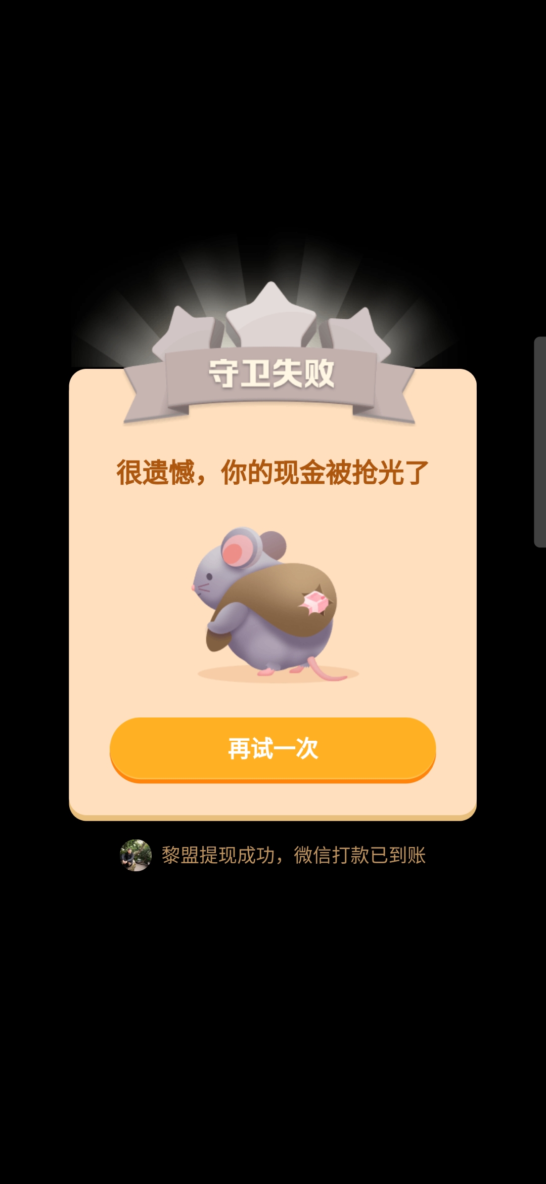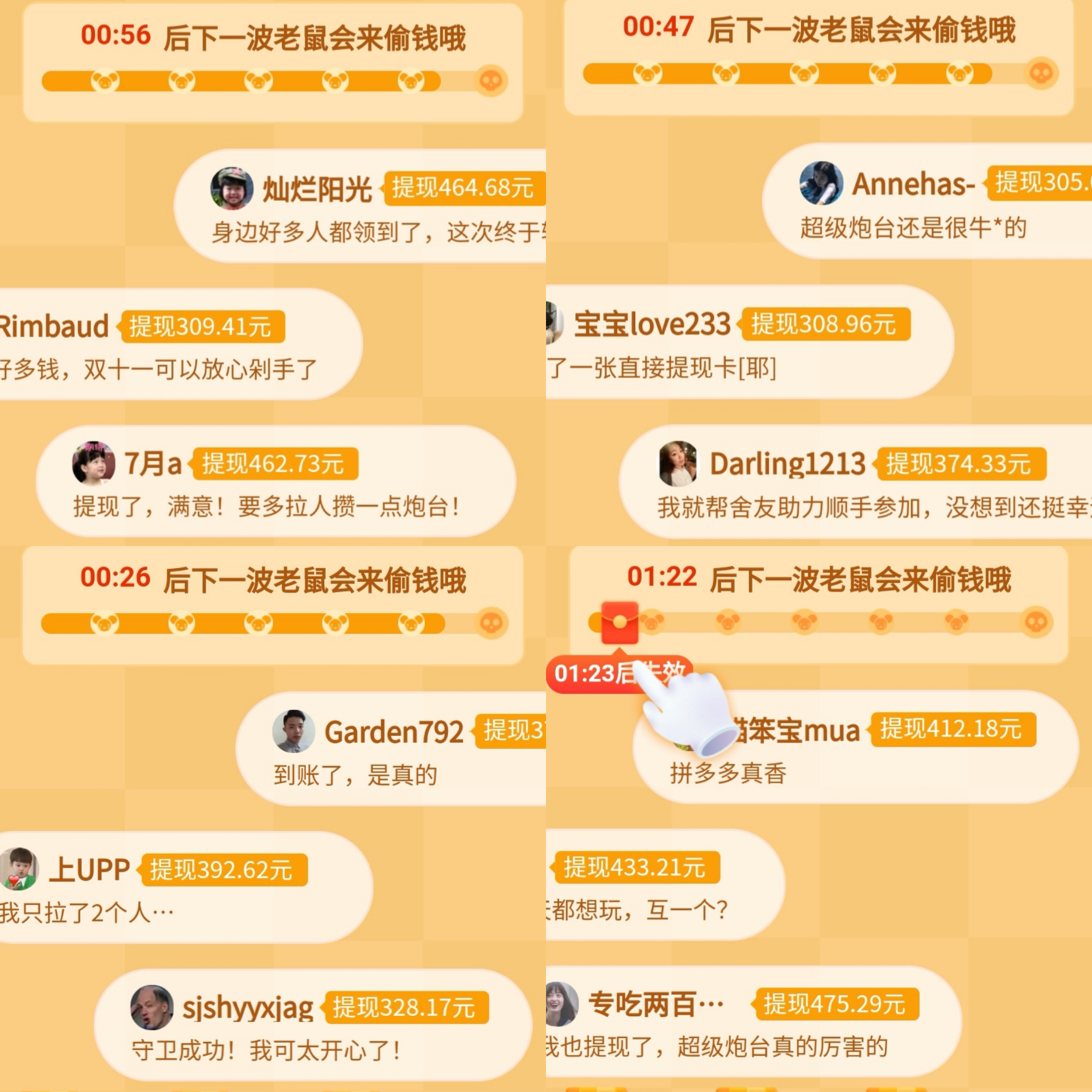 在没有老鼠攻击的时候,不断的会有弹幕飘过,显示别人提现的金额及留言,让人不得不心动,仿佛只要行动,提现三四百也是有机会的,如此来进一步刺激用户行动。