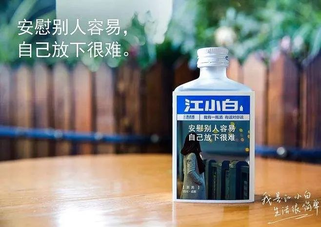例如江小白的神文案系列,往往放大人生中那些失落的、伤感的、消沉的瞬间,然后让被戳心的消费者,在一瓶酒中浇心中块垒。