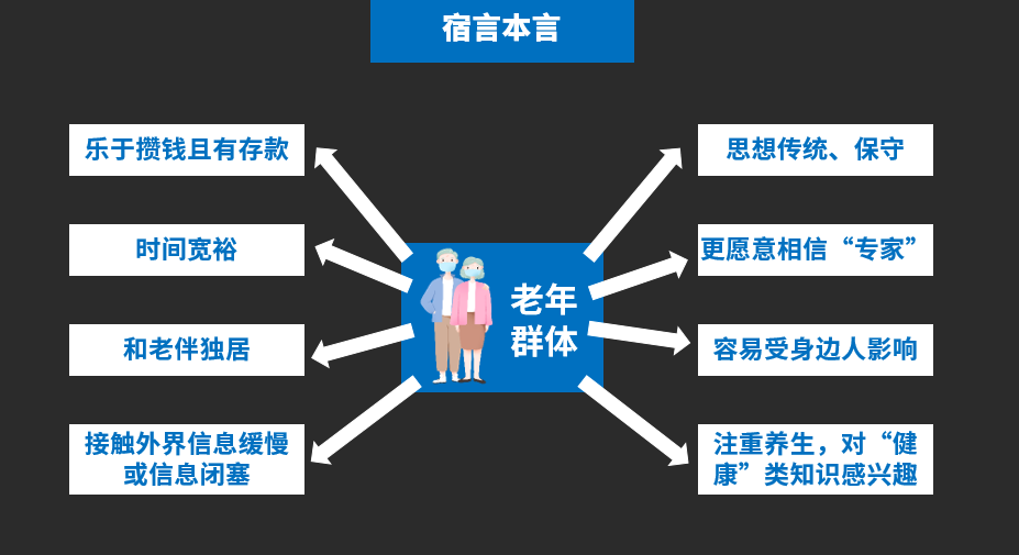 老年保健品的受众无疑针对的是"独自在家的老年人",随着中国步入老龄化社会,老年人市场也逐渐被商家重视起来。老年群体的特征是有钱、有闲、孤独、信息闭塞、思想传统、相信专家等。保健品的产品品类也都是围绕老年人的特性"精心设计"的!产品全部围绕着老年人的生活展开。