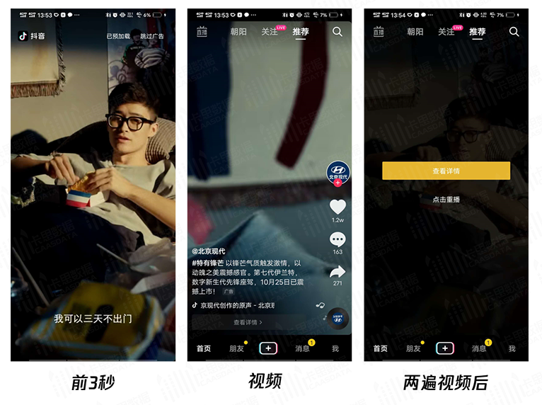 其特点是将广告分为两个阶段,第一个阶段是持续3秒的全屏展示,第二个阶段才会逐渐露出品昵称、头像、互动按钮、描述、广告标注等信息,并支持跳转。