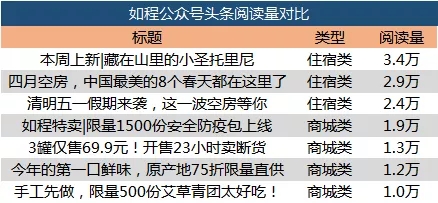 今年2月,如程官方上线了自建商城,从卖笋,卖水果,到卖养肾大补丸,你能想到和不能想的,它都开始卖了。截止目前,微信服务号一共头条推送过5次商城产品,阅读量浮动在1~2万左右,低于之前推送酒店住宿类的阅读量,可以看出他们的会员对应商城类信息接受度有所下滑。