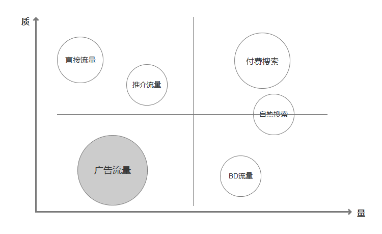 我们将流量数据按照它们在这两个维度上的表现展示在坐标轴上,不同的流量就会有不同的位置相对应,如果把流量的成本用圆圈的大小表示,就可以清楚的知道什么途径的流量是最好的。
