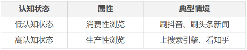 我们要尽可能高效地达到目的,就要明白用户在不同的时间和不同的平台上的认知状态是不一样的,我们可以将这种不同分为低认知状态和高认知状态。