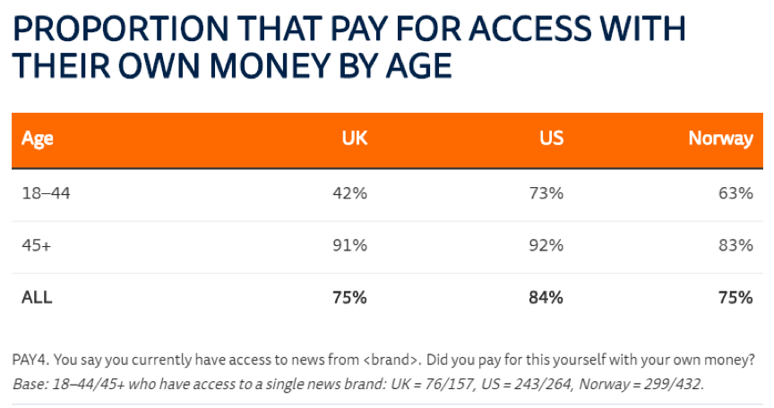 可以发现,能够自行承担在线新闻费用的人群,在英、美、挪威的比例分别为75%、84%、75%,年龄都在18岁以上。而消费的主力群体年龄主要集中45+,其中英国占91%、美国92%、挪威为83%