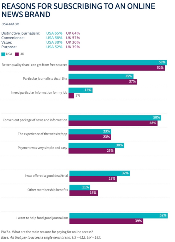 在美国和英国的受访人群中,订户都认为付费新闻的质量高于免费新闻。正如一位64岁的《华盛顿邮报》读者在采访中所说:“我的付费账户让我享受了高质量的新闻,没有理由不继续下去。”