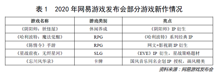 除了经典游戏外,网易还不断持续研发新款产品,在2020年的游戏发布会上,网易不仅推出了《阴阳师:妖怪屋》这样的IP衍生类游戏,以延长《阴阳师》系列游戏的生命周期并实现IP价值的持续提升,还发布了《哈利波特:魔法觉醒》、《陈情令》等超人气IP手游(见表1),这些将有望在迎合“Z世代”受众的同时,为网易游戏业务的增长注入新的动力。