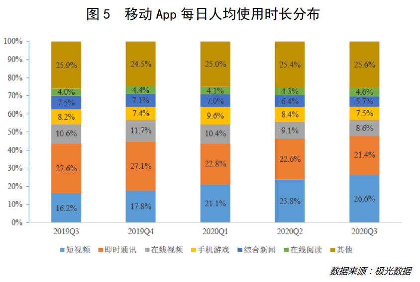 根据极光数据统计,2020年Q2,短视频行业用户时长占比正式超过即时通讯,居于所有移动App品类之首,2020年Q3该比例升至26.6%,与第二名即时通讯的差距进一步拉大(见图5);另外,根据伽马数据,移动游戏用户与短视频用户高度重合,二者的重合率在2020年Q2已达到82.5%,且呈现出明显的上涨趋势(见图6)。